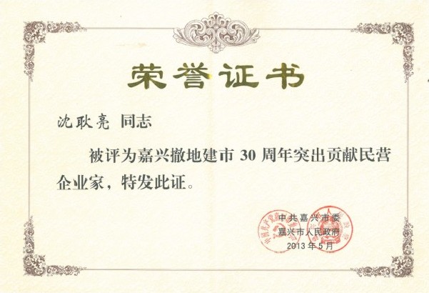 市委副書記高玲慧首先宣讀了市委、市政府《關于表彰嘉興撤地建市30周年民營企業發展先進集團和先進個人的決定》,市四套班子領導為獲獎企業和個人頒獎。公司董事長沈耿亮被授予“突出貢獻民營企業家”。